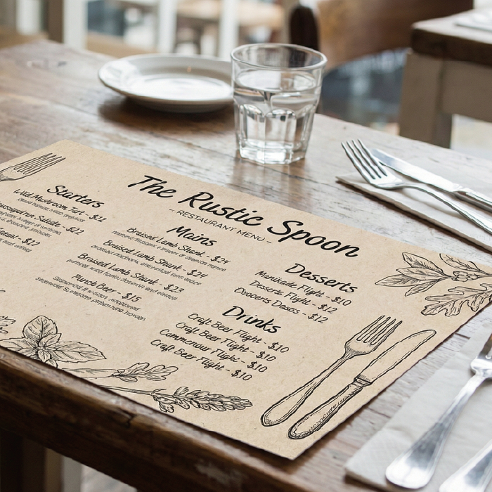 • Restaurant placemats (menus, QR codes, daily specials)
